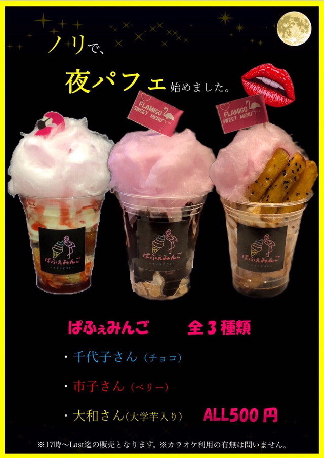 ぱふぇみんご 全3種類・千代子さん(チョコ)・市子さん(ベリー)・大和さん(大学芋入り)ALL 500円※17時~Last迄の販売となります。※カラオケ利用の有無は問いません。