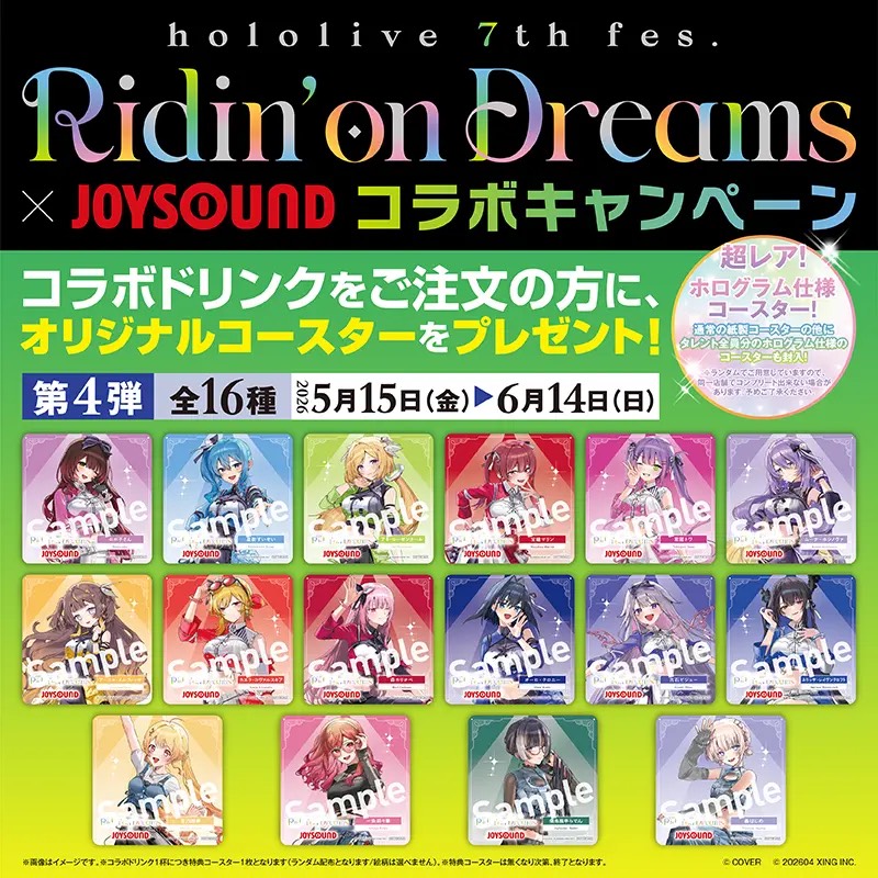 「hololive 7th fes. Ridin' on Dreams」の各公演をイメージしたオリジナルコラボドリンク(全4種)が登場します!第1弾[4月3日(金)~5月3日(日)]では16種、第2弾[4月17日(金)~5月17日(日)]では14種、第3弾[5月1日(金)~5月31日(日)]では15種のオリジナルコースターを、第4弾[5月15日(金)~6月14日(日)]では16種のオリジナルコースターを、1点のご注文につき1枚、特典としてプレゼントします。(ランダム配布となります/絵柄は選べません)また、ホログラム仕様のレアコースターもランダムで封入! (特典コースターはなくなり次第、終了となります。)お楽しみに♡